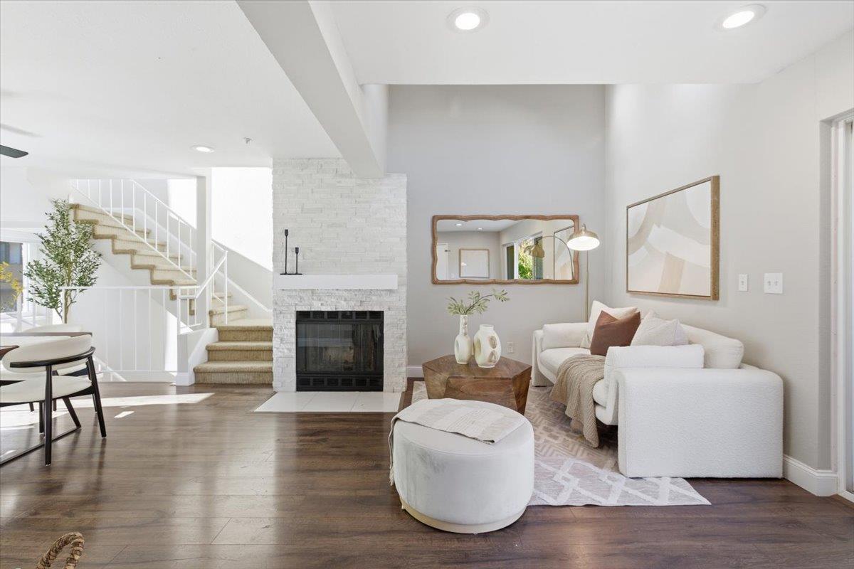 Welcome to this beautifully updated, light-filled 3 bedroom, 2 bath townhome in a well maintained community that combines comfort, convenience, & style. The flexible floorplan offers 2 bedrooms & a full bath on the first floor, 1 with sliding glass doors that open to a large private patio with direct access to the communitys greenbelt, perfect for indoor & outdoor living. Upstairs, the oversized primary suite is a true retreat, featuring laminate wood floors, a walk-in closet, & sliding doors to a sunny private balcony with treetop views. The main living area boasts a bright & open great room layout with a welcoming living room, fireplace, & sitting area. A separate dining space & another private balcony with lush garden views make entertaining a delight. The updated kitchen is designed for both style and function, complete with shaker style cabinets, a breakfast bar, stainless appliances, & a charming garden window. Additional highlights include a formal entry with wood laminate floors, abundant natural light throughout, & a huge attached two-car garage with custom storage cabinets. Located in a small, well-cared-for community close to shopping, parks, schools, & freeway access, this home truly shows pride of ownership and offers the perfect blend of relaxation and convenience.